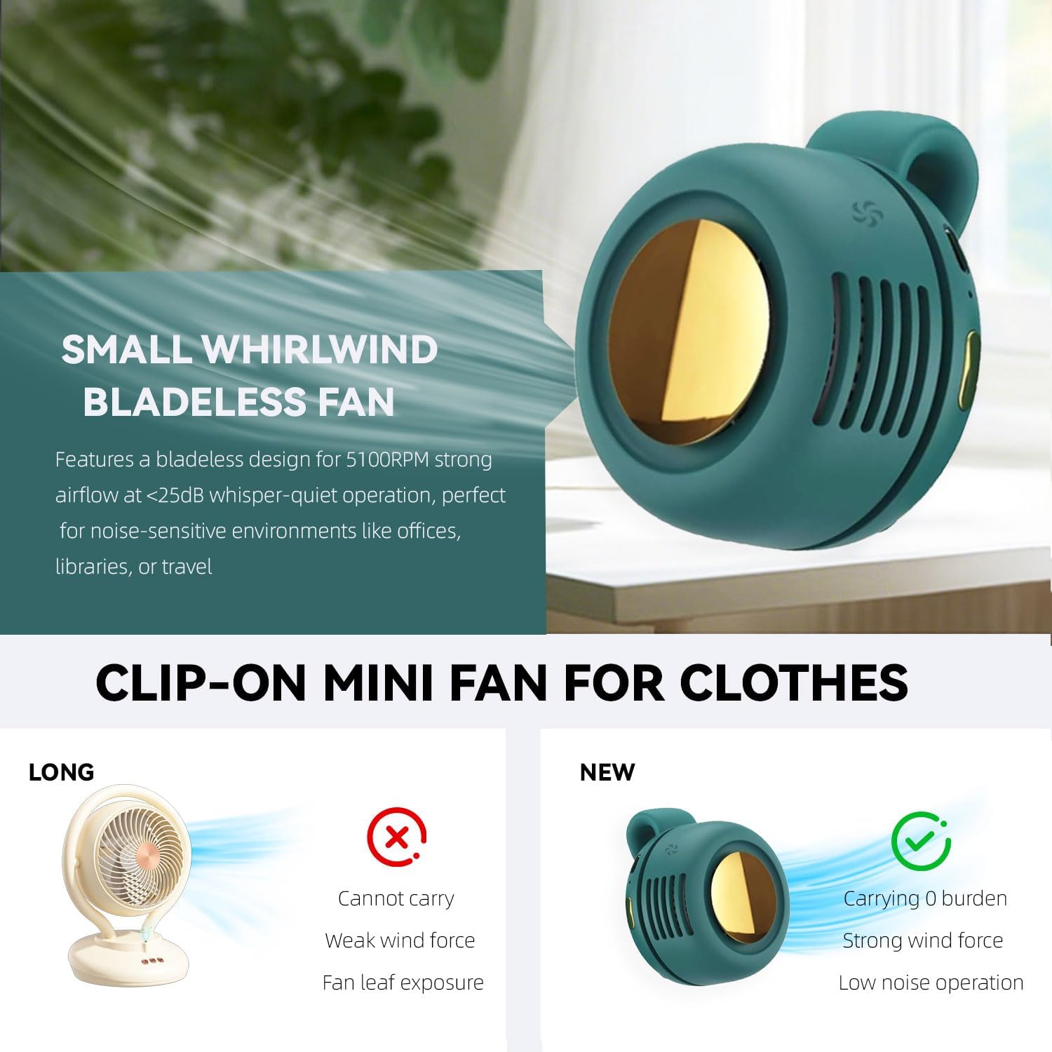 Most handheld fans are bulky, noisy, and use exposed blades that can be unsafe and inconvenient to carry.